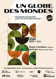 Du 19 juin au 13 décembre : L'exposition « Un globe, des mondes » s’intéresse aux globes virtuels, comme Google Earth, qui donnent l’illusion d’une représentation complète et objective de la Terre. À travers une approche scientifique et artistique, elle interroge ces outils numériques, leurs modes de fabrication et leurs effets sur nos perceptions du monde et des changements globaux. L’exposition propose de retracer l’histoire des globes virtuels, de les déconstruire et d’explorer leur influence sur nos imaginaires, tout en ouvrant la voie à des écritures géographiques alternatives. Ce projet Arts/Sciences, débuté en 2023 et financé par l’ANR, repose sur un dispositif de recherche-création associant artistes, scientifiques et habitants. Il prend la forme d’une exposition itinérante, présentée successivement à Mana (Guyane) en 2024, à Val-d’Or (Québec) en 2025, puis à Bordeaux en 2026. L’exposition est présentée au musée d’Aquitaine et au Géodock, à la Maison des Suds, sur le campus de l’Université Bordeaux Montaigne à Pessac.