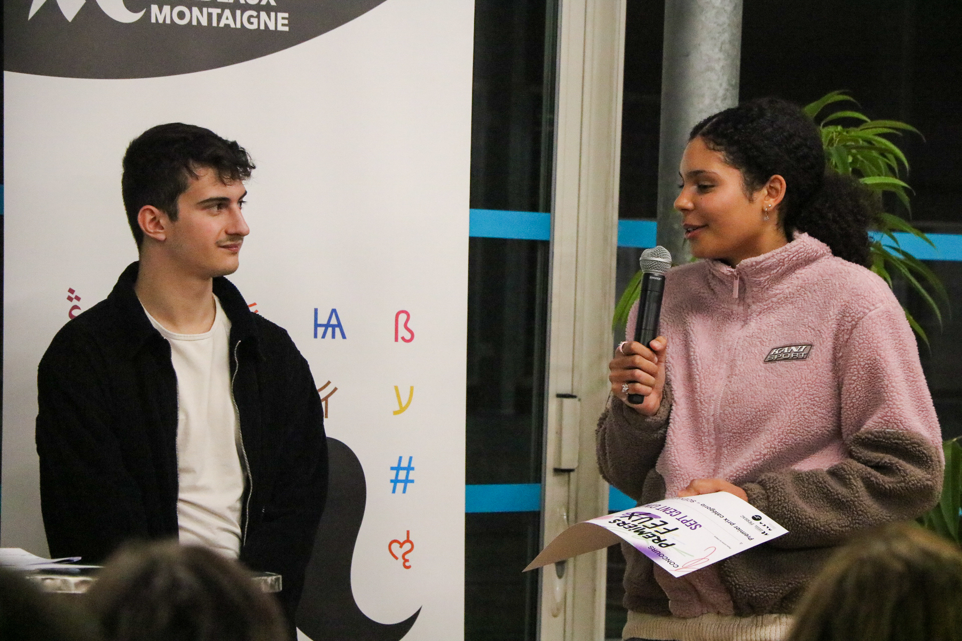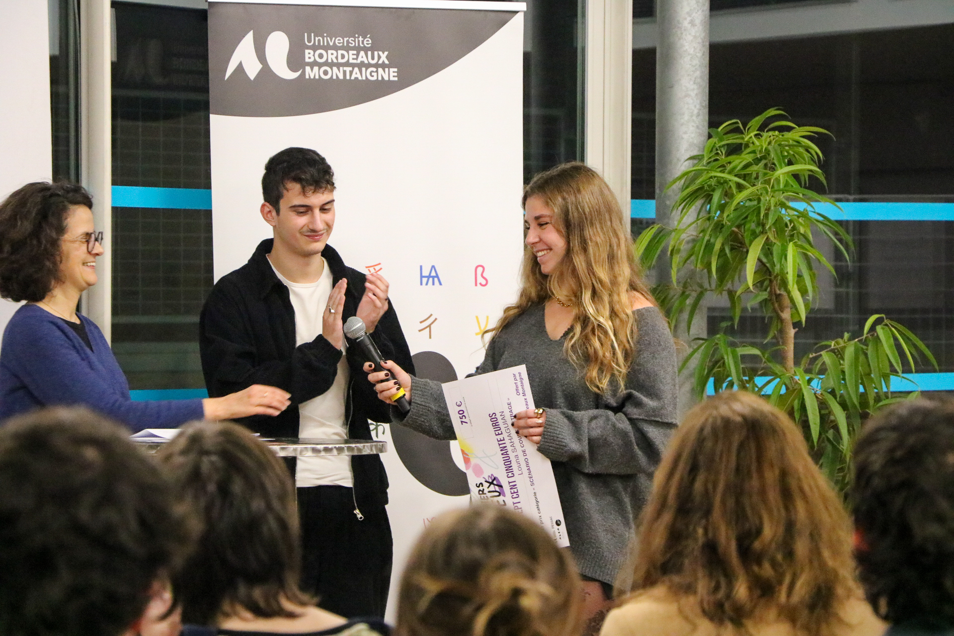 Lundi 9 décembre 2024, l’Université Bordeaux Montaigne et la Ville de Pessac ont remis les prix aux 10 lauréat·es de la quatrième édition du concours d’écriture Premiers Feux. Le rendez-vous a eu lieu dans l'espace Romy Schneider, au 3e étage du centre culturel Jean Eustache à Pessac. en savoir plus +