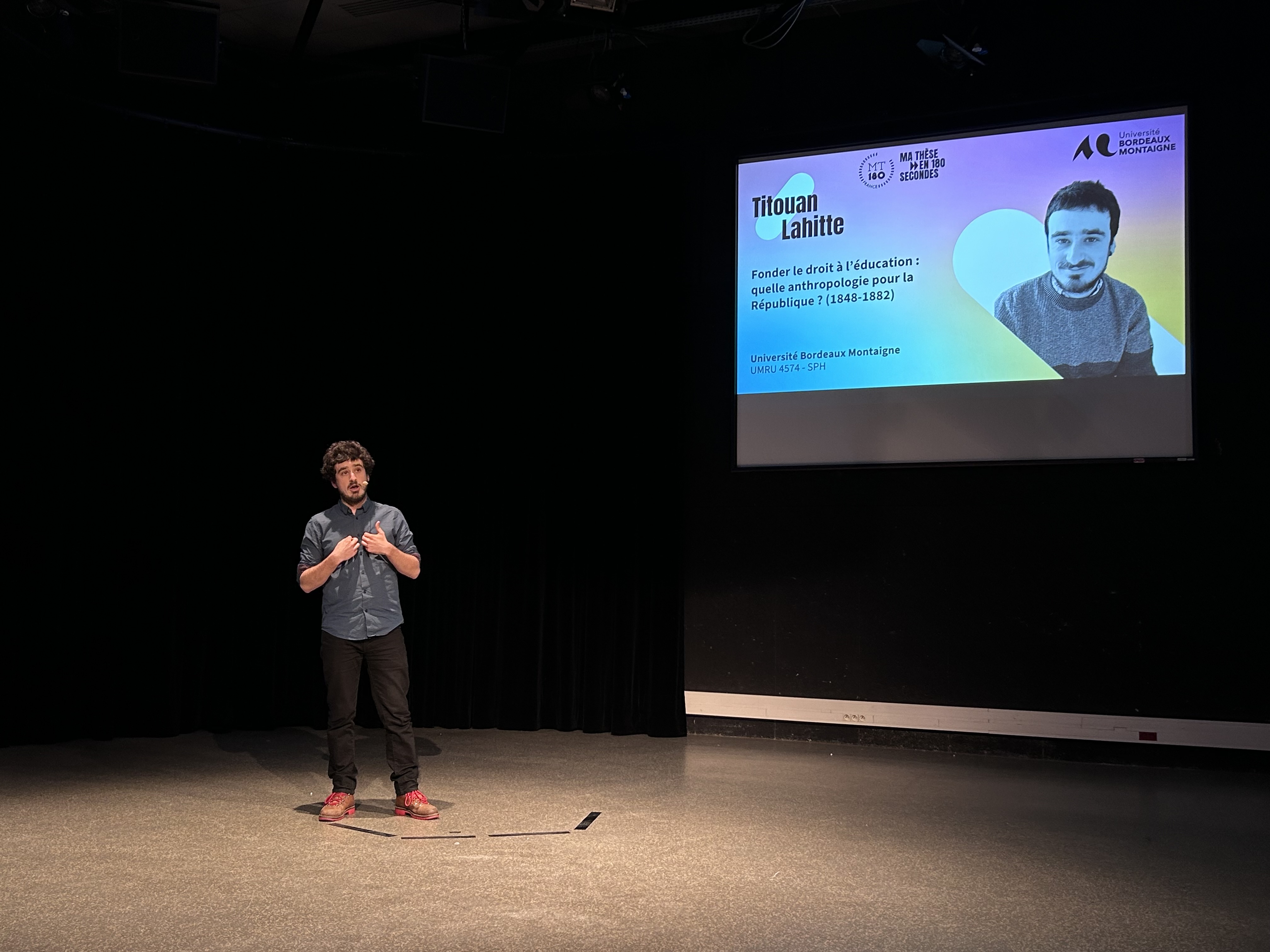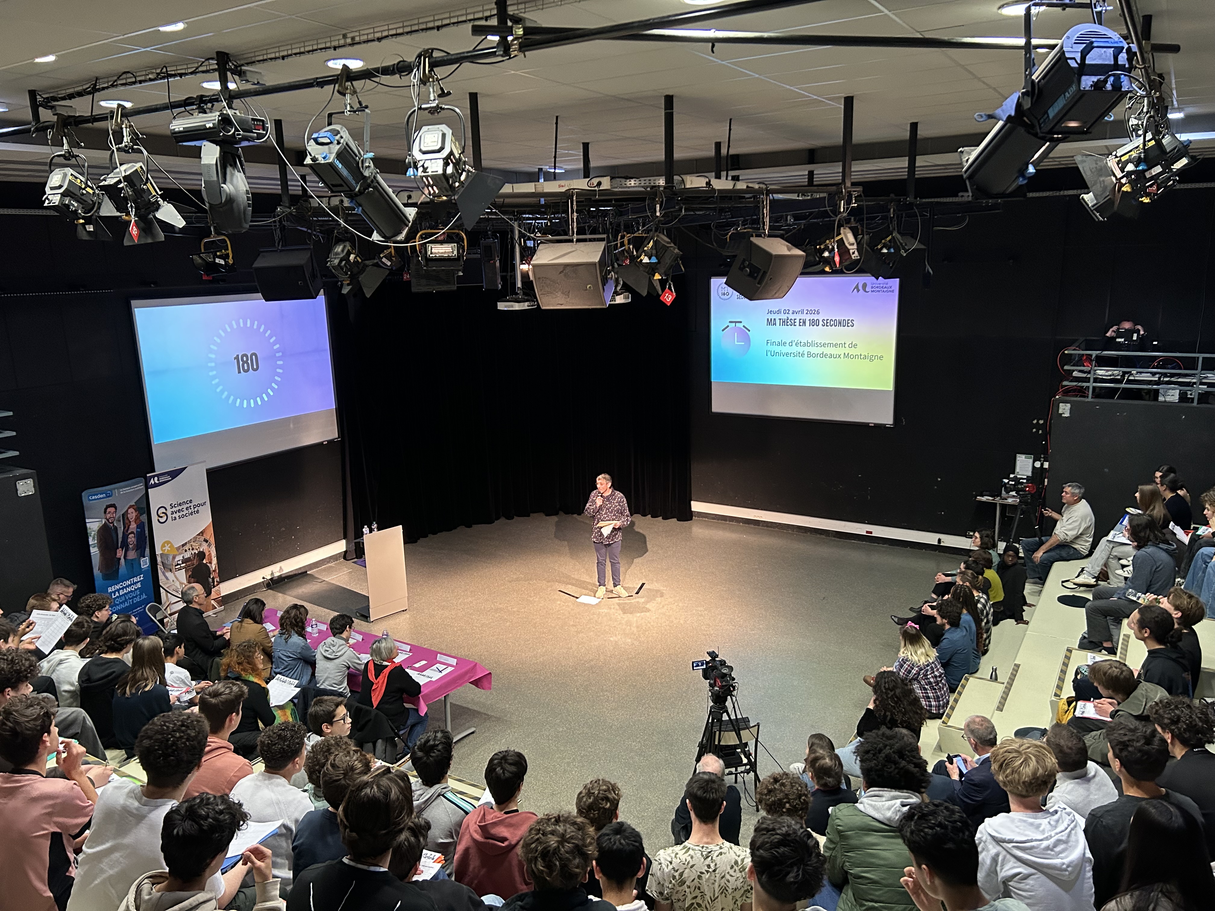 Le public, dont le vote qualifiait immédiatement un·e doctorant·e pour la finale régionale, était imposant : quatre classes des lycées Gustave Eiffel, Brémontier et Saint-Louis (Bordeaux) dans la salle, mais aussi cinq autres classes des lycées Saint-Caprais (Agen), Val de Garonne (Marmande), Saint-Cricq (Pau) et Antoine de Saint-Exupéry (Terrasson-Lavilledieu) à distance, et plus d’une centaine de personnes en direct sur YouTube.