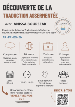 Découvrir un métier au croisement des langues et du droitL’événement sera animé par le cabinet de traduction assermentée Aljamía. L’équipe est composée de sa fondatrice, Anissa Bourezak, traductrice assermentée et enseignante en Master 2 traduction à la Sorbonne Nouvelle, de sa collaboratrice Meggy Michaud, ainsi que de trois stagiaires (deux en traduction et une en communication / événementiel).