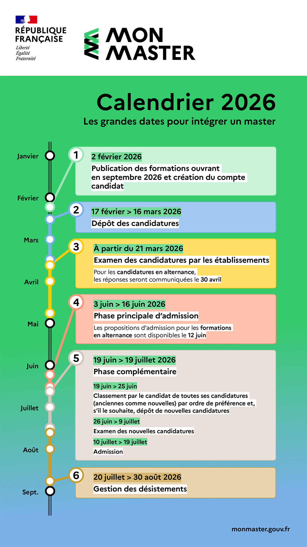 Calendrier 2026 de MonMaster (cliquer dessus pour l'agrandir)2 février 2026 : Publication de l’offre de formation ouvrant en septembre 2026