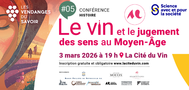 "Le vin et le jugement des sens au Moyen-Âge", avec Azélina Jaboulet-Vercherre, Historienne, spécialiste du vin et de l’ivresse au Moyen-Âge. Le mardi 3 mars 2026 à 19h - Évènement gratuit sur inscription. Une action culturelle portée par l’Université Bordeaux Montaigne et l’université de Bordeaux, sous l’impulsion de l’Institut des Sciences de la Vigne et du Vin (ISVV).