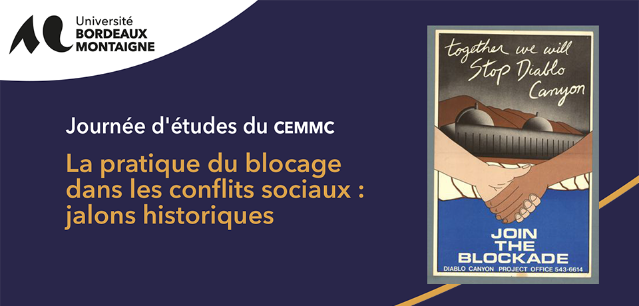 Journée d'études organisée par Dominique Pinsolle, maître de conférences en histoire à l'Université Bordeaux Montaigne (unité de recherche CEMMC). Cette manifestation scientifique a pour objectif d'aborder sur le temps long (du XIXe siècle à nos jours) le blocage comme action contestataire.
