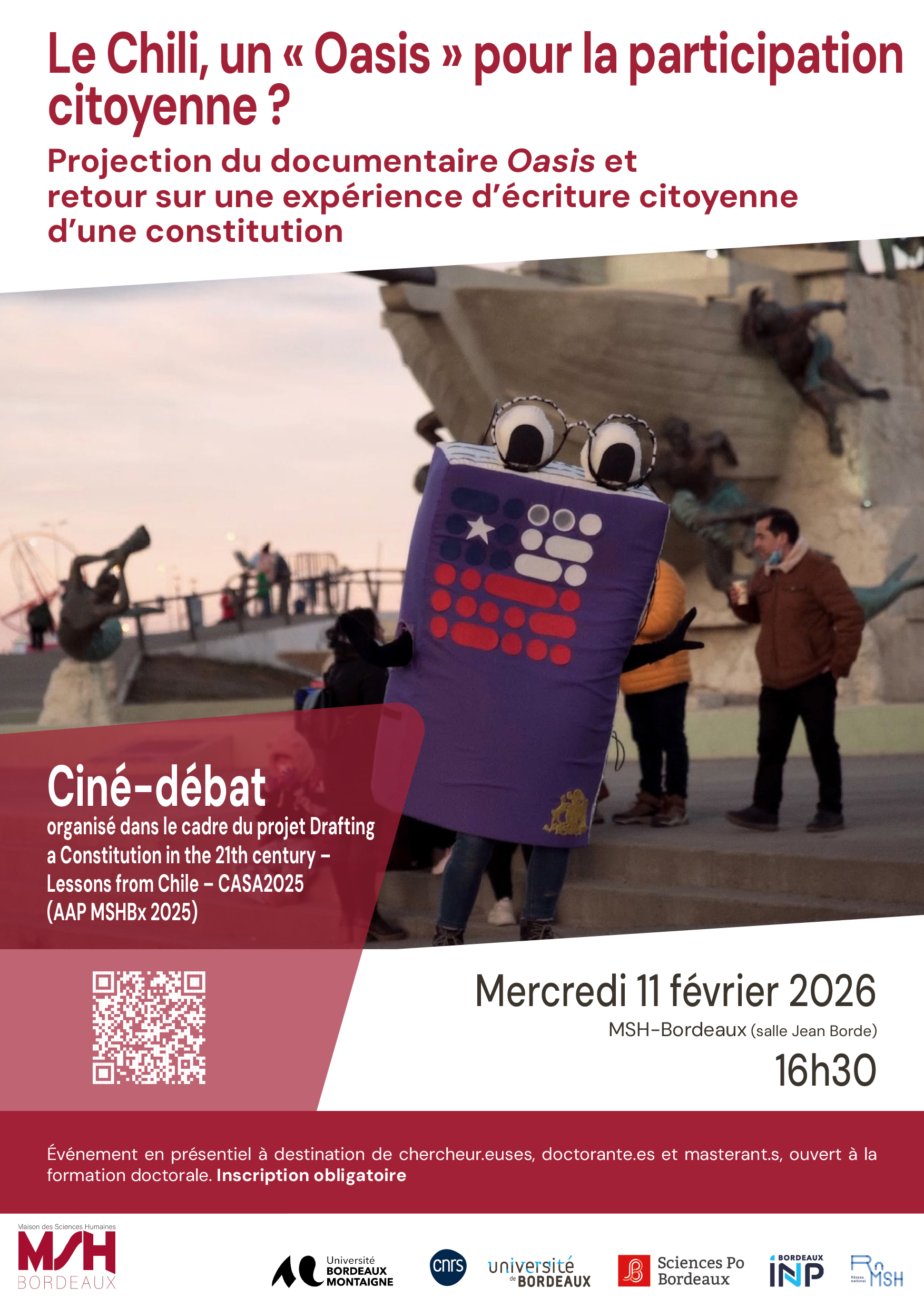 Événement en présentiel à destination de chercheur.euses, doctorant.es et masterant.es, ouvert à la formation doctorale. Inscription obligatoire: https://www.mshbx.fr/2026/01/13/le-chili-un-oasis-pour-la-participation-citoyenne/