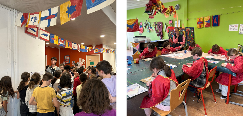 Les élèves de CE2, CM1 et CM2 ont exploré la diversité de la vie marine et sa préservation à travers la création d’un Grand Pavois, un ensemble de pavillons inspirés du code international des signaux maritimes. Chaque pavillon, peint par un élève à l’aide d’encres naturelles, représente une espèce marine, mettant en lumière la richesse des océans.
