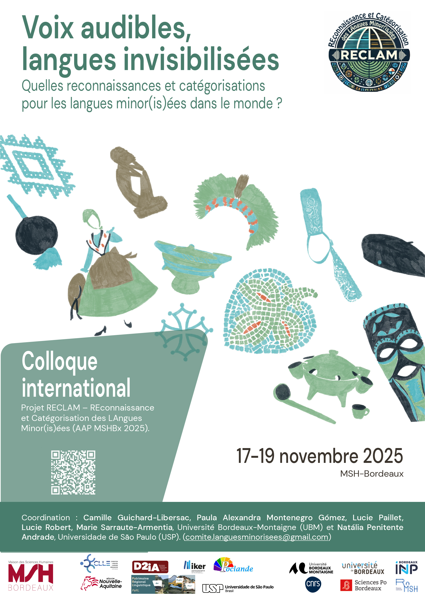 Suite à un premier workshop préparatoire franco-brésilien qui s’est déroulé les 21 et 22 janvier 2025 à Bordeaux, pensé comme un laboratoire de réflexion autour des pratiques de recherche et de communication scientifique, ce colloque international RECLAM proposera trois grands axes de réflexion — catégorisation / transmission / épistémologie — autour de la thématique des langues minor(is)ées.