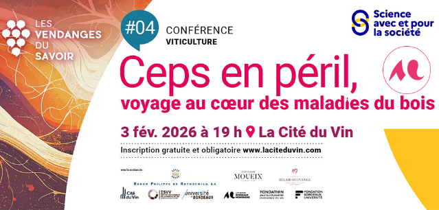 "Ceps en péril - Voyage au cœur des maladies du bois", avec Chloé Delmas, Directrice de recherche en physiopathologie végétale à l'INRAE Bordeaux. Le mardi 3 février 2026 à 19h - Évènement gratuit sur inscription. Une action culturelle portée par l’Université Bordeaux Montaigne et l’université de Bordeaux, sous l’impulsion de l’Institut des Sciences de la Vigne et du Vin (ISVV).