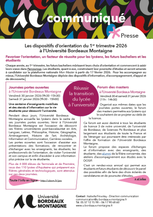 Cliquer pour télécharger le communiqué en PDFChaque année, au 1er trimestre, les futurs bacheliers mûrissent leurs choix d’orientation et commencent à saisir leurs vœux dans Parcoursup. Les étudiants, quant à eux, construisent leur poursuite d’études et seront amenés à candidater sur la plateforme nationale Mon Master à partir du 17 février 2026. Pour les accompagner au mieux, l’Université Bordeaux Montaigne déploie des dispositifs d’information, d’accompagnement, d’appui et de découverte.