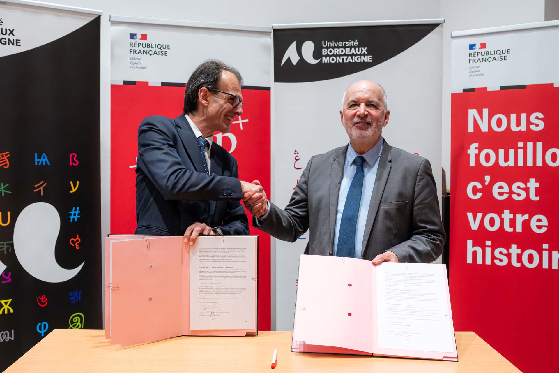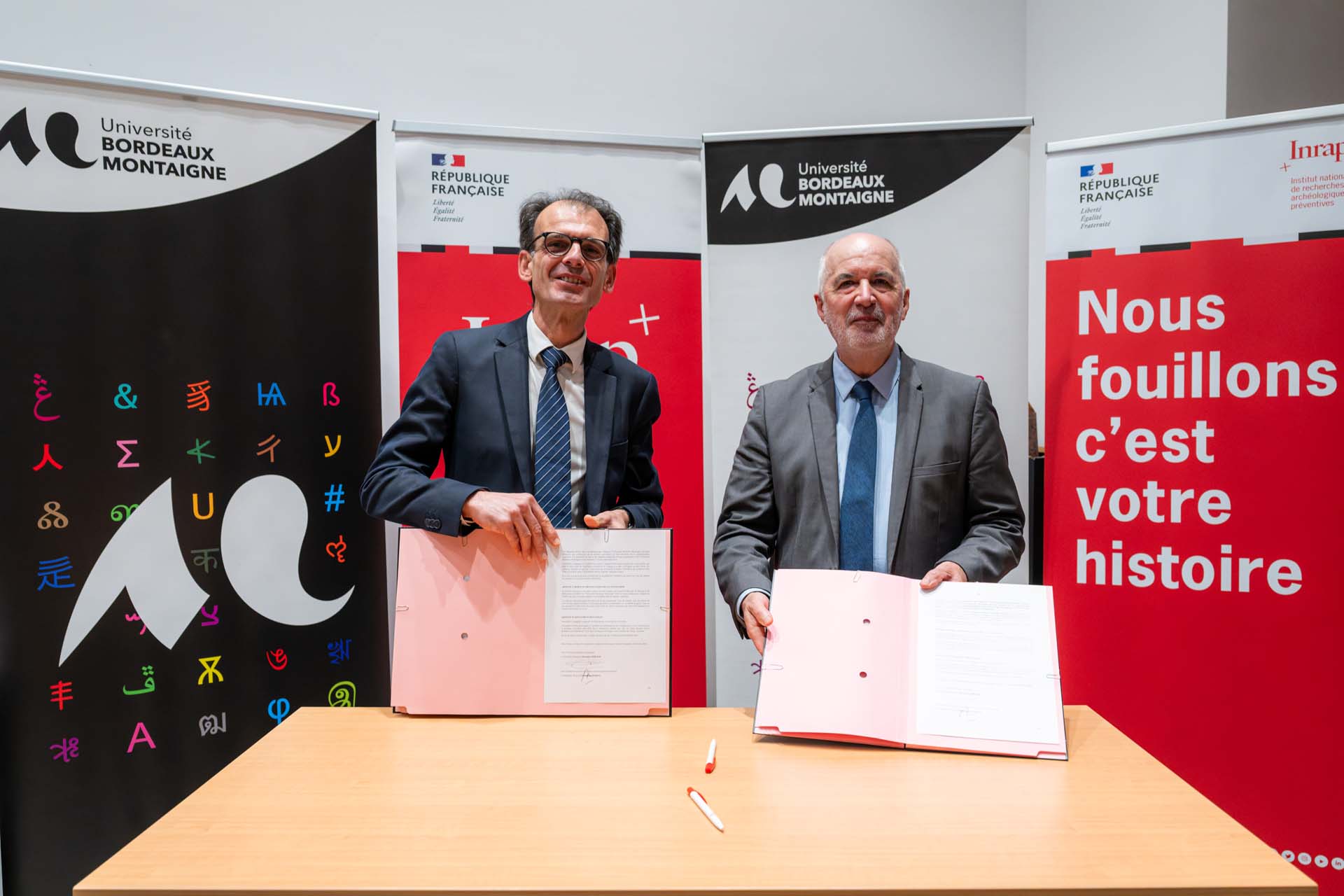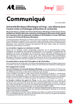 Le 4 mars 2026 à l'Archéopôle d'Aquitaine, Alexandre Péraud, président de l’Université Bordeaux Montaigne et Dominique Garcia, président de l’Institut national de recherches archéologiques préventives (Inrap) ont signé une convention cadre de partenariat scientifique et de formation.